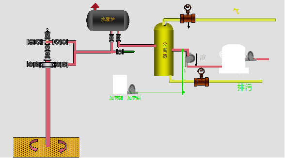 原油脫硫一般采取直接注入原油中, 在三相分離器后加藥,設(shè)備需要一臺(tái)注入泵和一個(gè)分散器或霧化器裝在管道中央。上游的注入點(diǎn)和下游的接受器之間要有足夠的距離,以確保有充足的反應(yīng)時(shí)間,處理后原油逸出H2S的指標(biāo)低于10PPm以下。生成產(chǎn)物一般為多硫化合物鹽,性能穩(wěn)定,經(jīng)過聯(lián)合站破乳脫水后,隨污水排出。工藝流程如圖下: